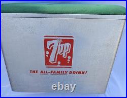 Vintage 1960’s Metal/Aluminum 7 Up Soda Pop Embossed Cooler with Green Padded Top. This wonderful Authentic cooler is very large and all original. Overall in excellent condition for its age, there is some wear and marks throughout. Nothing of major significance though. The top green padding has one cut in it and some old tape marks (shown in photos) Each handle has their original red rubber coating on them and under each there is a bottle opener. I also believe I have the metal tray insert but have not located it as of yet, if I do, I will upset the listing accordingly. The top opens only when the red button is depressed, and it opens flawlessly. Around the perimeter of the top there was a rubber Gasket type of seal which has worn over time but remnants still remain. This can be taken off with some minimal work. (This is something I did not do though) I’ve only performed a quick cleaning to the cooler by wiping it with warm water, I did not scrub it at all, just a quick topical wipe. I’d imagine this will clean up really nicely if someone was inclined to get into it! Overall a really excellent example of a vintage cooler! Outside Width: 13.5. Outside Height: 16.5. Inside Height: 13.5. Please send me any of your questions and if you’d like any additional photos feel free to message me anytime! Thank you for looking and have a wonderful day!